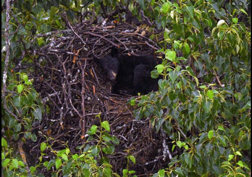 野生熊隻霸佔鳥巢不算罕見,過去幾年觀察到不少老鷹的鳥巢遭到黑熊襲擊,導致老鷹無法回到巢中孕育下一代。而照片中的鳥巢是研究人員於今年5月所拍攝,當時有一隻母鷹正在孵蛋,但因為黑熊入侵,導致鳥蛋被擱置無法孵化,老鷹夫婦只能在鳥巢附近盤旋徘徊。