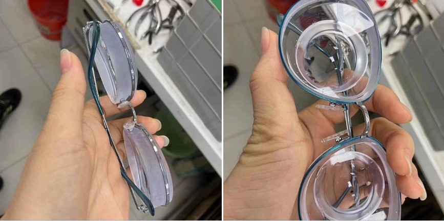 原PO日前在臉書上傳兩張照片,並PO文寫道「這是一副2800度的眼鏡…」畫面中可見,照片中人物手上拿著一副細框眼鏡,仔細一看卻發現,這副眼鏡竟然配置了兩片超厚鏡片,從側面來看,幾乎有一個手指頭的指節那麼厚,目測將近3公分;此外,鏡片中間還有兩片圓形的開圈,目的是使中間鏡片更薄、整體重量更輕。