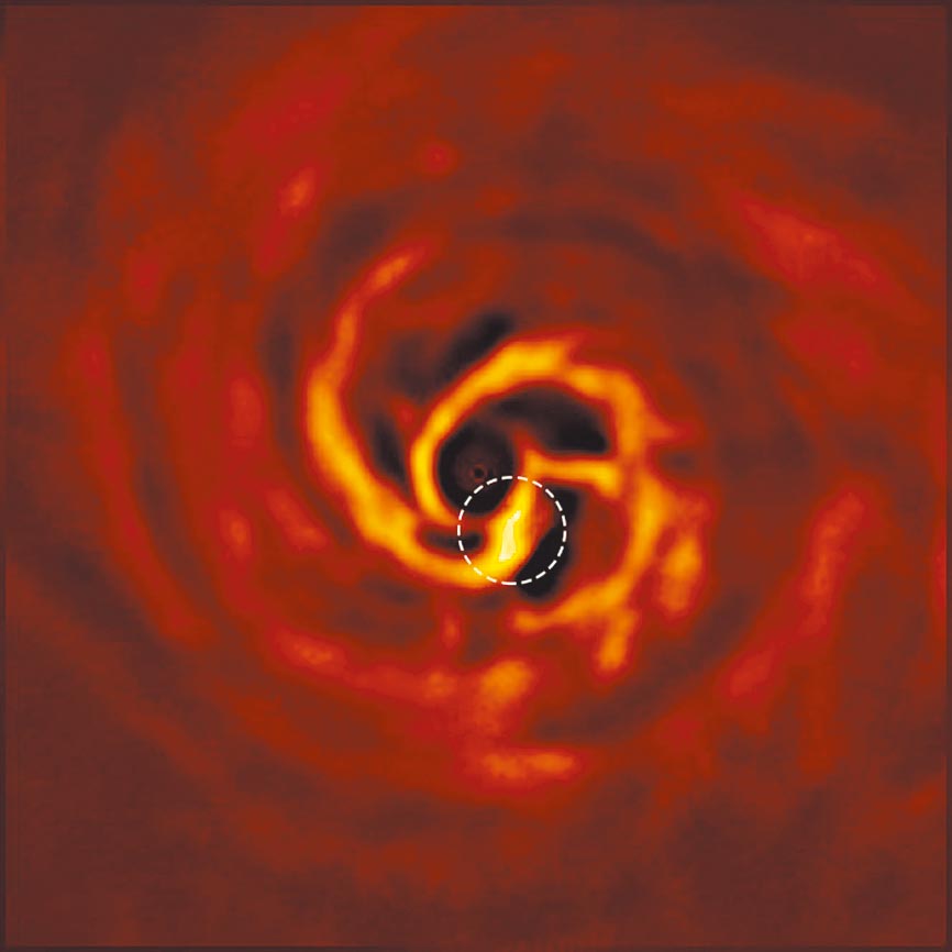 接著,當兩個旋臂彼此相連,發出明顯亮黃色「扭結」(twist),這是因為溫度較低的氣體塵埃互相結成團塊而明顯發光-正與行星誕生理論相符合,天文學家推測,行星是由圍繞年輕恆星的塵埃盤中氣體和塵埃相連在一起所誕生的,認為可能是新生行星正誕生中的直接證據。