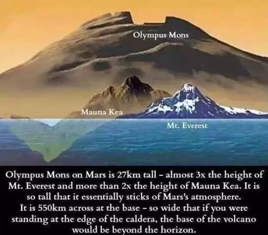 奧林帕斯山有27公里高,幾乎是聖母峰的3倍高,也比毛納基火山(從水底山腳計算)的2倍還要高。奧林帕斯山已經高聳進火星的大氣層了,它的基底有550公里那麼寬廣,意思也就是,如果你站在破火山口來看的話,它的山腳會一路綿延超過地平線。13.而這座巨型火山,大概也跟一個法國差不多大。