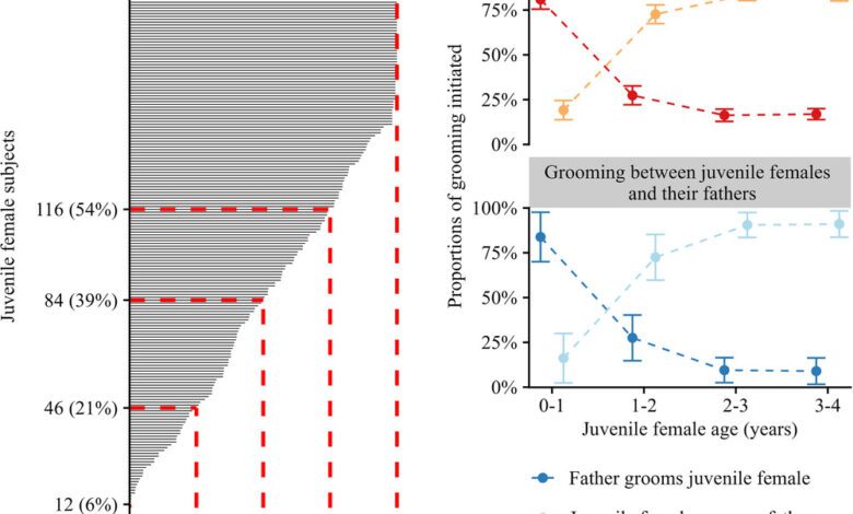 右側兩個子圖顯示:隨著母狒狒年齡增長,她們與父親或其他成年雄性的理毛主動性變化。