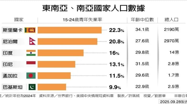 龐大年輕人口應是推動經濟的強大引擎,卻在東南亞與南亞逐漸淪為「失業陷阱」。印尼及尼泊爾接連爆發青年示威抗議,對執政者形成威脅。這些年輕人用智慧手機和社群,點燃了被外界形容繼阿拉伯之春的「亞洲之春」。