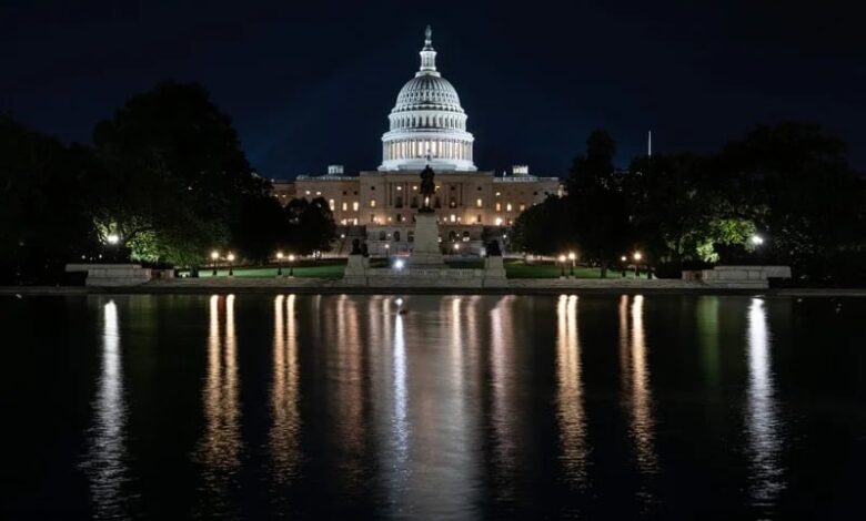 美國華府的國會山莊9月30日在聯邦政府關門生效前數小時燈火通明。法新社