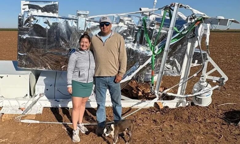 德州居民沃特(左)日前目擊NASA走失設備從天而降在鄰居家的麥田,讓她直呼「超不真實」。圖/取自@YahooNews在X的照片