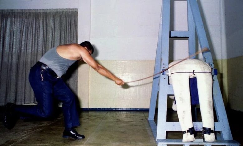 根據新加坡刑法修正草案,詐騙主謀、詐騙集團成員或負責招募他人的共犯,將面臨強制鞭刑6至24下的刑罰。圖為行刑官示範鞭刑資料畫面。路透