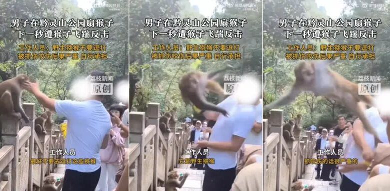 綜合中國荔枝新聞等媒體報導,貴州貴陽黔靈山公園10月17日有一名男子動手扇打猴子臉,隨後立即遭到猴子飛踹反擊。網傳影片可以看到,猴子原先蹲坐在欄杆上,白衣男子停在猴子面前,突然伸手打向猴子臉部,賞猴子一個巴掌。