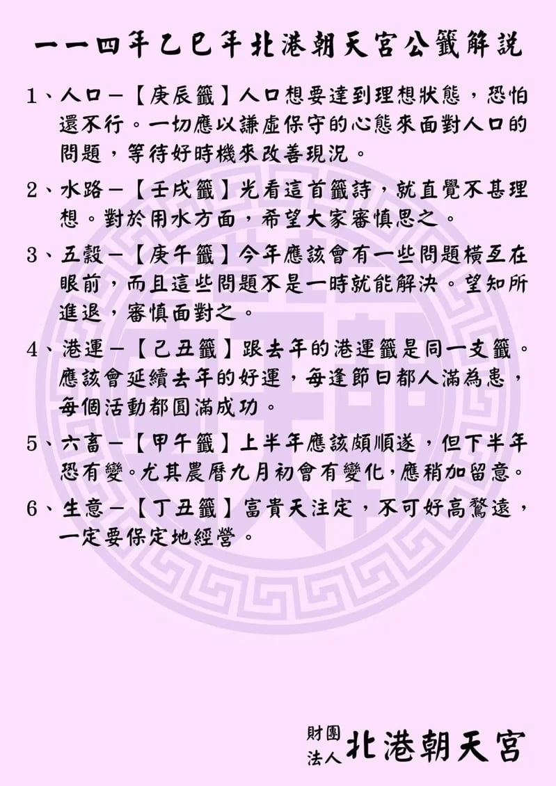 蔡詠鍀說,六支公籤中也有「港運籤」,港運並非只代表北港,抽出的籤若好全國都會好,範圍概指全國,六支籤都差不多一樣,值得各行各業參考並作思考和準備,一旦覺得運勢不佳,也可媽祖祈求一切平安順心。