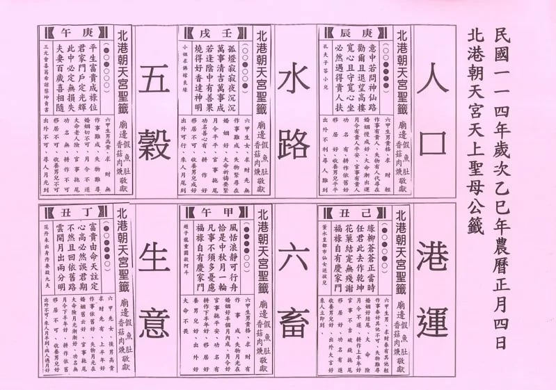 今年2月1日也是大年初四,朝天宮在完成接神儀式後,由朝天宮董事長蔡詠鍀代表抽公籤,所抽出的人口、水路、五穀、港運、六畜及生意籤6支公籤。其中「六畜籤」是抽得中「甲午」籤。