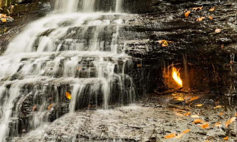 在美國紐約州西部的栗嶺公園(Chestnut Ridge Park)深處藏著一處罕見的自然奇觀——永恆火焰瀑布(Eternal Flame Falls)。位於瀑布水流後方的一個小石窟內,一團約20公分高的火焰在日夜燃燒,形成了世上極為罕見的「水火共存」景象。