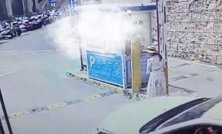 雲南昆明呈貢區當地某社區的停車場,拍到驚險畫面,一輛紅色轎車駛過停車場出入口後,出現一名頭戴帽子、身穿長裙的女子,不但沒有躲開降下來的閘門,反而以肉身扛住閘門;沒多久有一輛白色轎車通過,女子隨後坐上車離開。