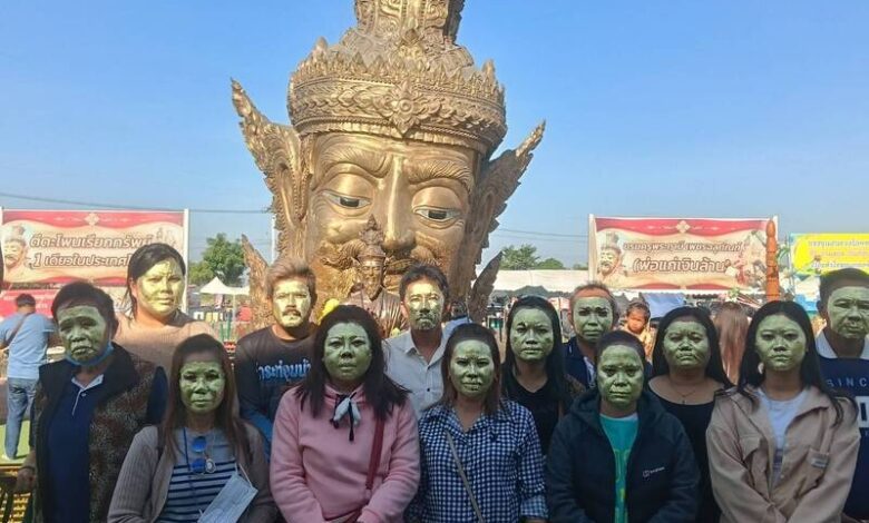 這間寺廟位於泰國大城府,不少信徒會到此地參拜求財。廟方臉書粉絲專頁貼出數張照片,可見13名信徒的臉上貼滿類似金箔的紙張,光彩奪目,並與廟內供奉的「百萬長者」神像合影留念。