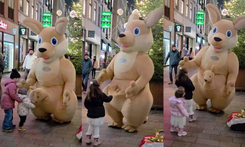 母湯喔!「袋鼠親子」現身街頭與民眾互動 全網一看影片壞笑