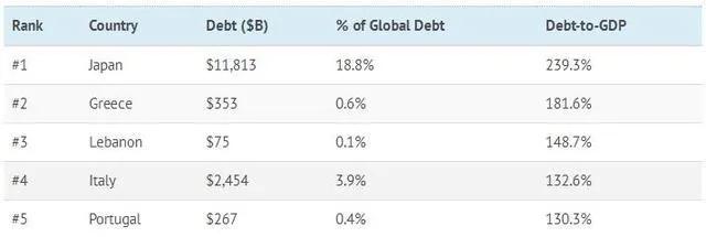 全球債務佔GDP最高的五個國家