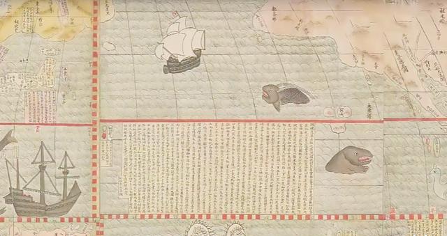 這張地圖繪製於明代萬曆年間,刻本在國內已經失傳。他的宮廷彩色摹繪本現被保存在南京博物院,是國內現存最早,也是唯一的一幅據刻本摹繪的世界地圖。這幅世界地圖的珍貴之處在於,它不僅是當時最先進、最詳細、最準確的世界地圖,而且更是我國海上絲綢之路的見證,是中西方文化交流的產物。朗朗乾坤、昭昭日月,《坤輿萬國全圖》讓當時的中國人第一次認識了世界。而那圖上佈滿關於地球知識的圖表和文字更像是一部關於地球的百科全書,強烈衝擊了中國人固守千年的天下觀。《坤輿萬國全圖》真容:嚴謹細緻,可讀性強《坤輿萬國全圖》長380cm,寬192cm,圖的開頭是用楷書題寫的圖名《坤輿萬國全圖》。古代用“乾坤”指天地,“坤”是地的意思,“輿”的本意是車底座,延伸為“承載萬物”。因此,《坤輿萬國全圖》也就是今天所謂的世界地圖。整幅地圖由3個部分組成:橢圓形、顏色豐富的世界地圖;4個角上的天文圖和地理圖;解釋說明文字。主圖部分給人強烈的震撼。顏色淡雅,視覺舒適,便於觀看。例如,粉紅色的是南北美洲,淡黃色的是亞洲;山脈以用淡綠色勾勒,河流以雙曲線繪寫,海洋用深綠色畫出波紋。地圖還採用了“圖文結合”的插畫形式,極具時代特色。在各大洋中,還畫有16世紀的帆船,鯨、鯊、海獅等海生動物;南極大陸上有大象、獅子、駝鳥、恐龍等動物。