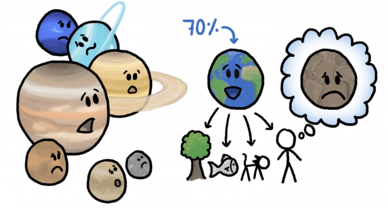 與太陽系中其他的行星不同,地球表面70%是由液態水組成。雖然水對生物來說是有用的,但也有些人感到疑惑,因為地球形成方式、時間的相關資訊,都顯示地球表面應該是「骨幹」。