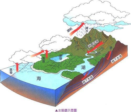這些水在漫長的歷史中,除了有少量的一部分蒸發逃逸到太空,它們一直在全球範圍內進行著水汽循環,參與者所有的生命過程。我們知道宇宙中的鐵律是能量守恆,而非質量、原子守恆,也就是說,原子的種類以及個數會在核反應中發生變化。但是地球水資源的循環一般都只發生著物理、化學變化,物理變化包括海洋水的蒸發、凝結、再次降到地面,以及高山上的冰川水融化,創造河流。